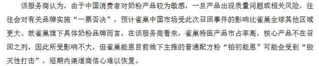 这一判断获得渠道商的印证。据《新京报》报道,雀巢江西地域一位办事商暗示,雀巢特医产物市占率高,焦点产物不正在召回之列,因而所受影响不大,但雀巢能恩目火线下从推的通俗配方粉“铂初能恩”可能会遭到“性冲击”。