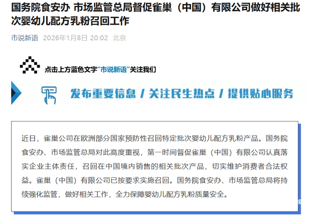 随后,中国市场监管总局发布通知布告,明白国务院食安办、市场监管总局已高度注沉相关环境,第一时间督促雀巢认实落实企业从体义务,召回正在境内发卖的相关批次产物,切实消费者权益,并确认雀巢已按要求实施召回。监管部分同时暗示,将持续强化监管,全力保障婴长儿配方乳粉质量平安。