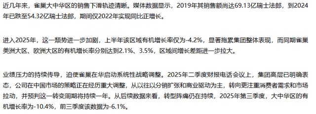 近年来,雀巢大中华区发卖额呈现较着下滑趋向。据《华夏时报》报道的数据显示,该区域发卖额从2019年的69。13亿法郎跌至2024年的54。32亿法郎,期间仅2022年实现同比正增加。进入2025年,这一颓势进一步加剧。大中华区无机增加率为-4。2%,显著拖累集团全体表示。比拟之下,同期雀巢美洲大区和欧洲大区别离实现了2。1%和3。5%的正增加。到第三季度,大中华区无机增加率更是下探至-10。4%,前三季度累计为-6。1%。
